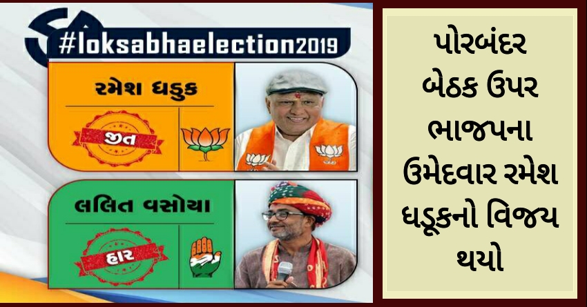 પોરબંદર બેઠક ઉપર ભાજપના ઉમેદવાર રમેશ ધડૂકનો વિજય થયો