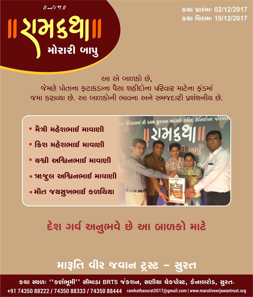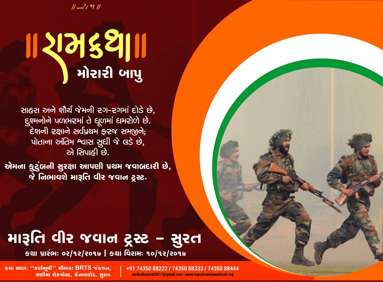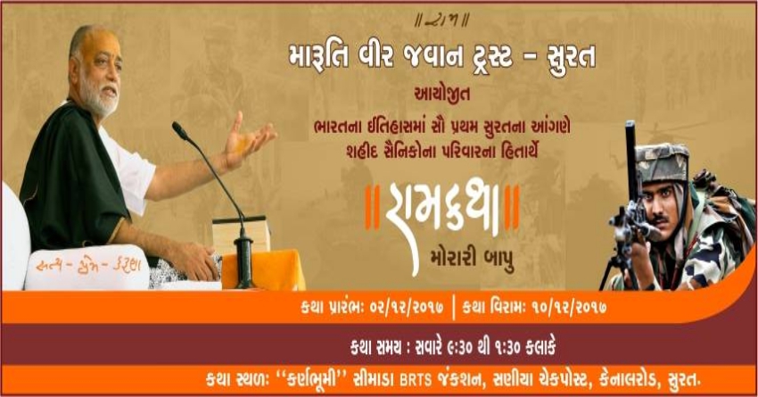 સુરતના અગ્રણી નનુભાઇ સાવલિયા દ્વારા સ્થાપવામાં આવેલા મારૂતિ વીર જવાન ટ્રસ્ટ દ્વારા દેશના વીર સૈનિકો માટે આગામી તા. ૨જી ડિસેમ્બરથી ૧૦મી ડિસેમ્બર સુધી પૂજ્ય મોરારીબાપુની રામકથાનું આયોજન સુરત ખાતે કરવામાં આવ્યુ છે. બીઆરટીએસ જંકશન સણીયાગામ ખાતે યોજાનારી આ ભવ્ય રામકથાના મંડપને બાપુએ કર્ણભૂમિ નામ આપ્યુ છે.