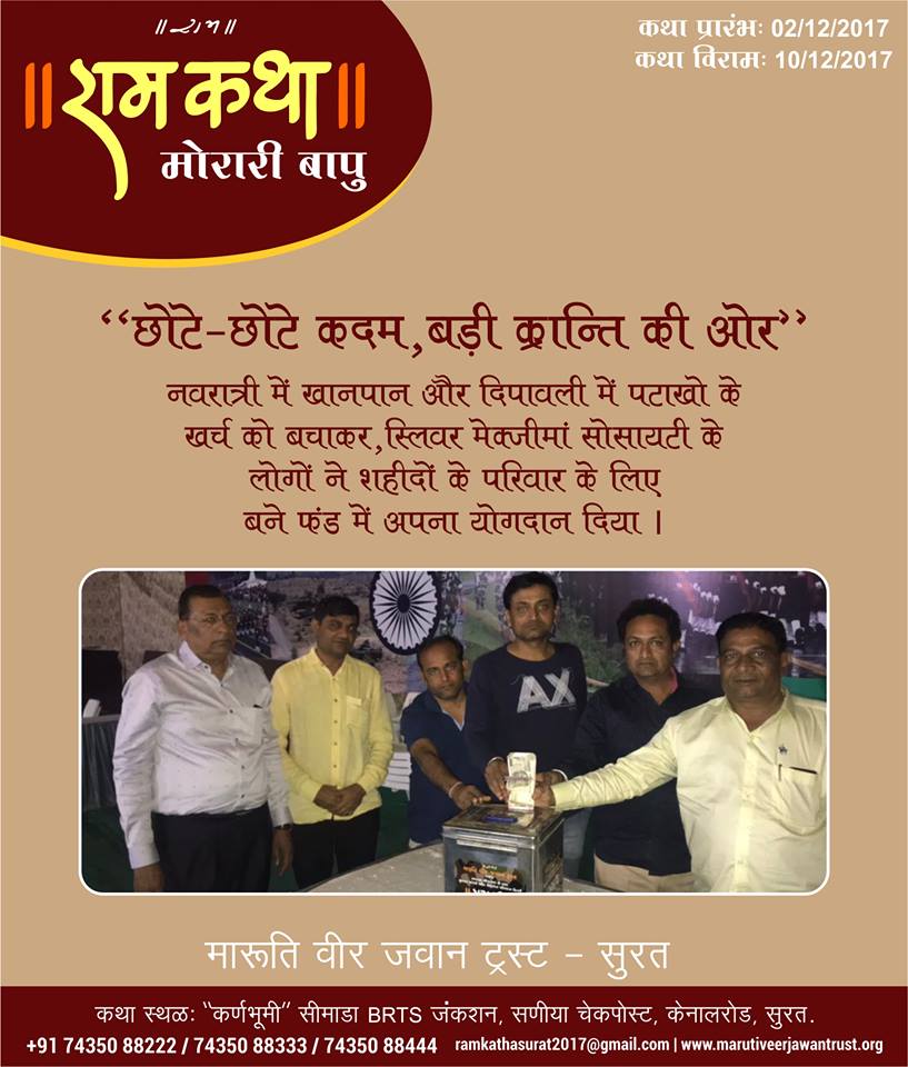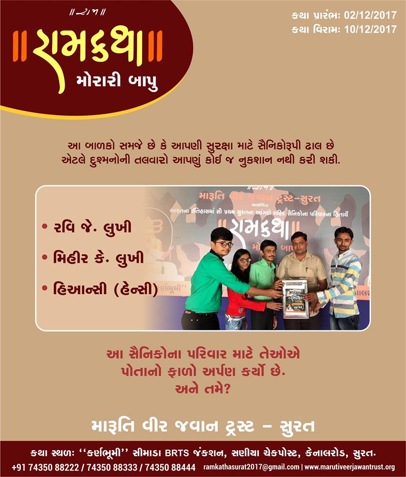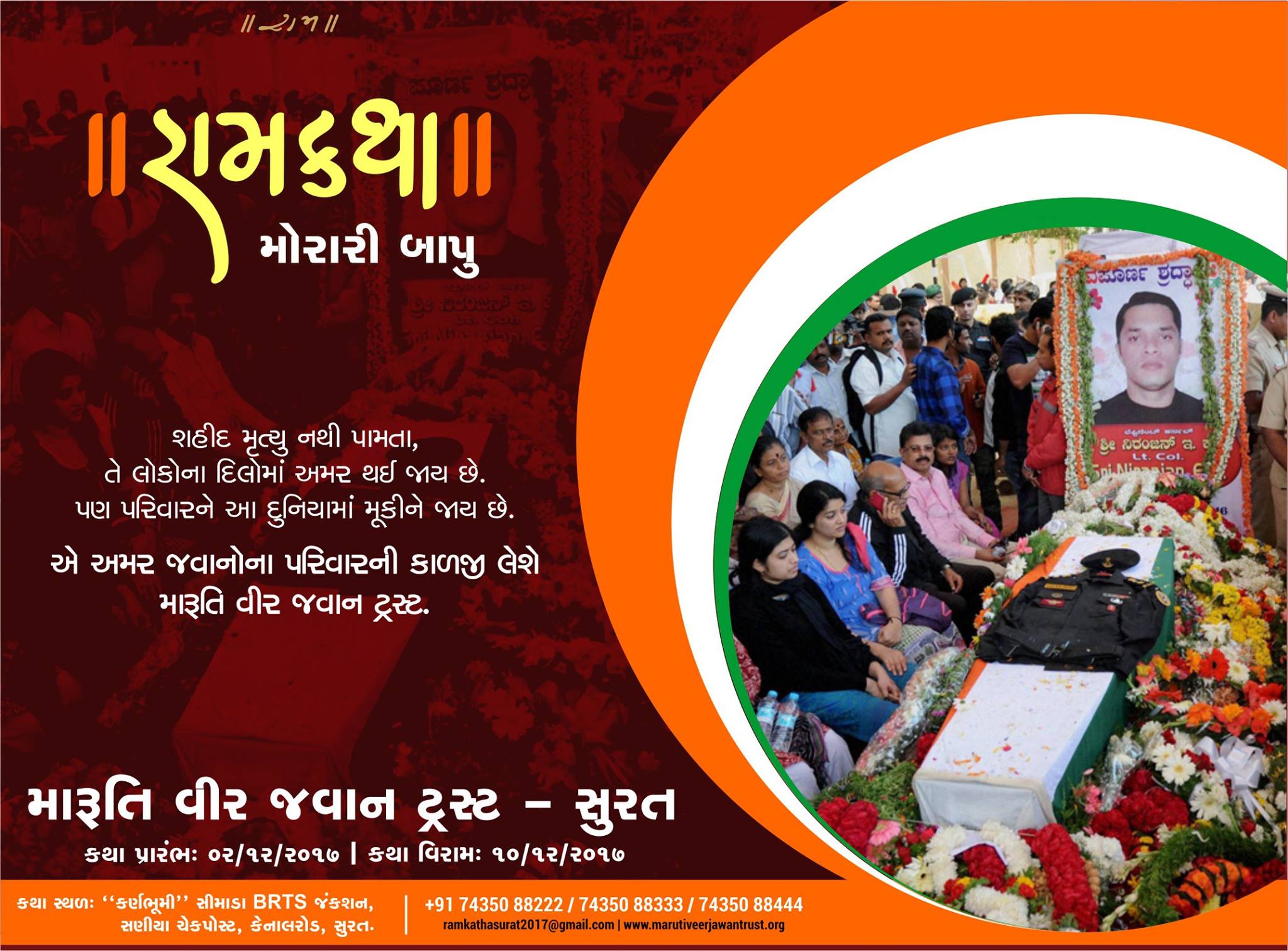 સમગ્ર દેશના સીમાડાઓનું રક્ષણ કરતા વીર જવાનોના પરિવારના લાભાર્થે સુરતમાં આગામી ડિસેમ્બર મહિનામાં મારૂતિ વીર જવાન ટ્રસ્ટ દ્વારા પૂજ્ય મોરારીબાપુની રામકથાનું આયોજન કરવામાં આવ્યુ છે. આ રામકથાની તૈયારીઓ શરૂ થઇ ગઇ છે.