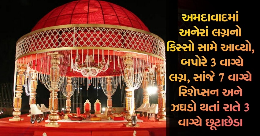 હાલમાં ચાલી રહેલા લગ્નગાળા વચ્ચે અમદાવાદમાં એક અનેરાં લગ્ન યોજાયાં હતાં. જેમાં બપોરે 3 વાગ્યે યુવાન અને યુવતી લગ્નગ્રંથિથી જોડાયા હતા અને તે જ સાંજે 7 વાગ્યે બંનેનું રિશેપ્સન રાખવામાં આવ્યું હતું. તેમાં વરરાજાએ દૂધ પીવાની વિધિનો વિરોધ કરતા બંને પક્ષના સભ્યો વચ્ચે ઝઘડો થયો હતો. જોતજોતામાં આ ઝઘડાએ ગંભીર સ્વરૂપ ધારણ કરતા વરરાજા, કન્યા, જાનૈયા તેમજ કન્યાપક્ષના મળીને 300 માણસોનું ટોળું પોલીસ સ્ટેશન પહોંચ્યું હતું. જ્યાં 6 કલાક સુધી બંને પક્ષના સભ્યો વચ્ચે ચર્ચા વિચારણા ચાલી હતી, પરંતુ રાતે 3 વાગ્યે બંને પક્ષના સભ્યો તેમજ વરરાજા અને કન્યા છૂટાછેડા માટે સંમત થતાં મામલો થાળે પડ્યો હતો.