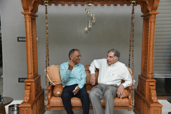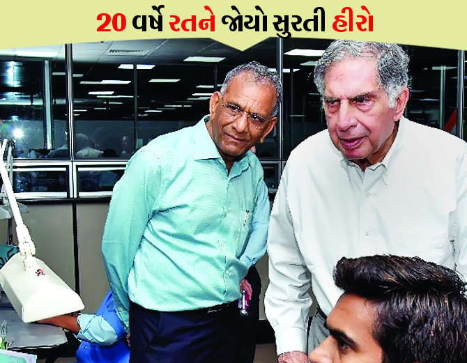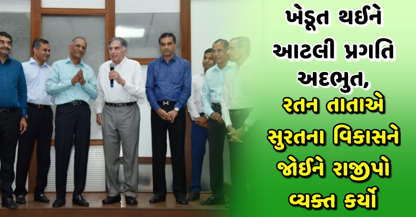 ભારતીય ઉદ્યોગ જગતના અગ્રણી તાતા ગ્રુપના પૂર્વ અધ્યક્ષ રતન તાતા આજે ગુરુવારે સુરતની શુભેચ્છા મુલાકાતે આવ્યા હતા. સુરતની અગ્રગણ્ય હીરા કંપની એસઆરકે ગ્રુપ(શ્રી રામકૃષ્ણ એકસ્પોર્ટ્સ)ની કતારગામમાં આવેલી આધુનિક ફેક્ટરી, કિરણ હોસ્પિટલ સાથે ધોળકિયા પરિવારના નિવાસસ્થાને નિરાંતે મુલાકાત કરી હતી. રતન તાતાએ હીરા ઉદ્યોગનું બારીકાઈથી નિરીક્ષણ કરીને એની ટેકનૉલોજી, એમાં કામ કરતાં કારીગરો અને ગોવિંદભાઈ ધોળકિયા વિષે વિગતો મેળવીને પોતાનો આનંદ વ્યક્ત કર્યો હતો અને સાથે જ સુરતની મુલાકાતને યાદગાર ગણાવીને સુરતના વિકાસ અંગે પોતાનો રાજીપો વ્યક્ત કર્યો હતો.
