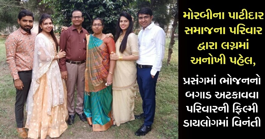 મોરબીના પાટીદાર સમાજના પરિવાર દ્વારા લગ્નમાં અનોખી પહેલ, પ્રસંગમાં જમવામાં ભોજનનો બગાડ અટકાવવા પરિવારની ફિલ્મી ડાયલોગમાં વિનંતી
