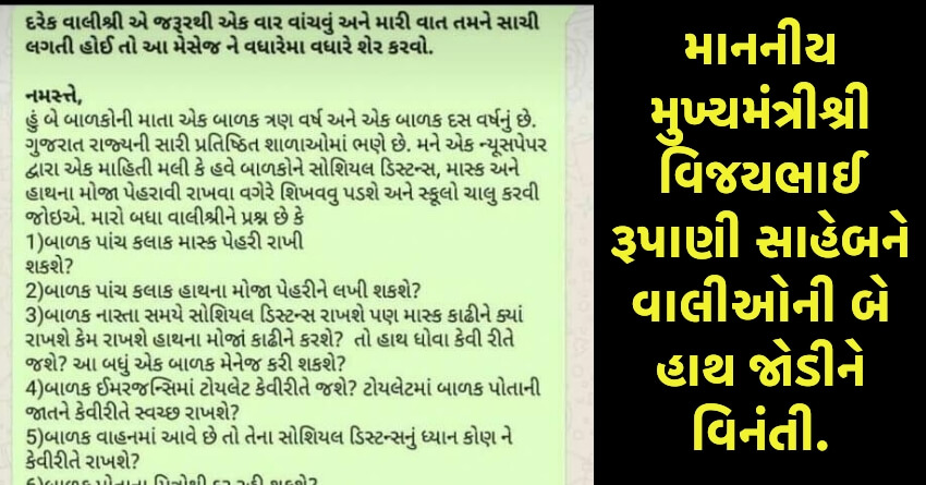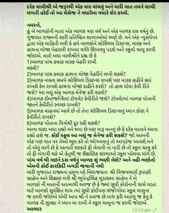 જેમાં લખે છે કે: આપ સરકાર ને વિનમ્ર અરજ છે કે ગુજરાત માં શાળા શરૂ કરવામાં મહેરબાની કરીને ઉતાવળ ન કરશો.