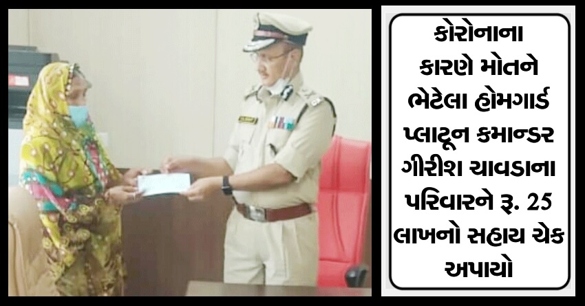 કોરોનાના કારણે મોતને ભેટેલા હોમગાર્ડ પ્લાટૂન કમાન્ડર ગીરીશ ચાવડાના પરિવારને રૂ. 25 લાખનો સહાય ચેક અપાયો