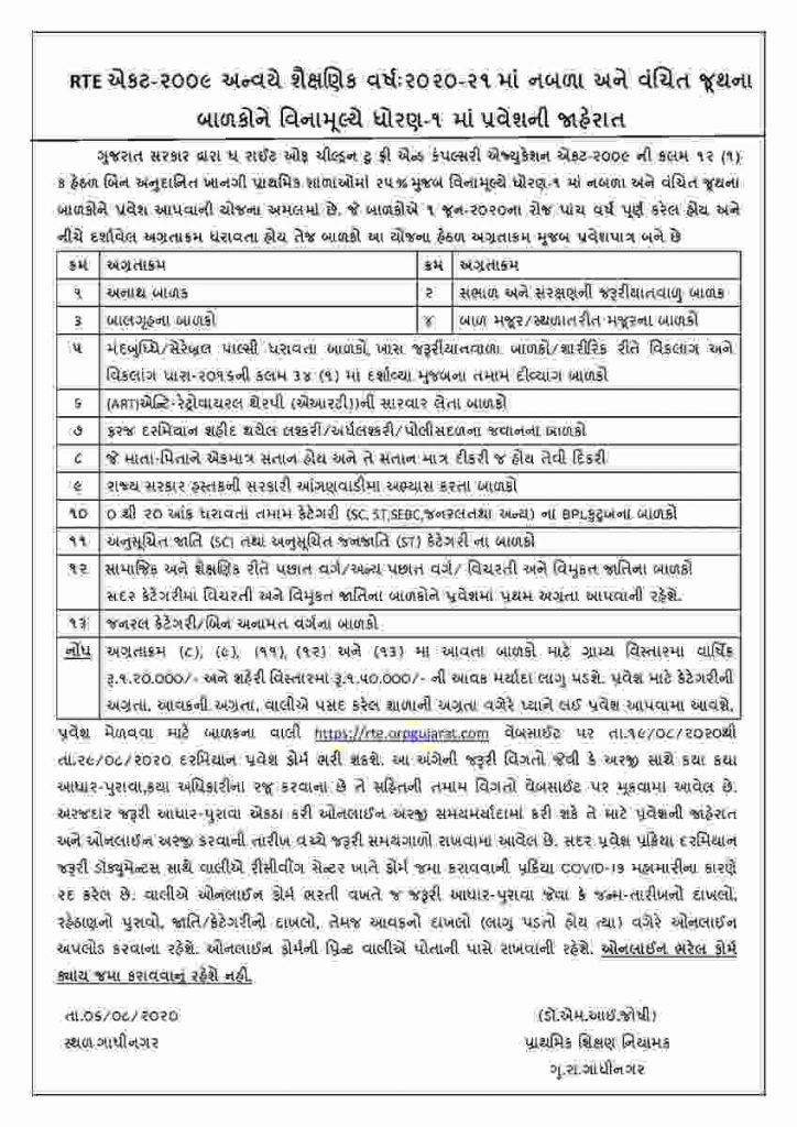 RTE એક્ટ હેઠળ પ્રવેશ મેળવવા માટે બાળકના વાલી www.rte.orpgujarat.com વેબસાઈટ પર તારીખ 19 ઓગષ્ટ 2020થી 29 ઓગષ્ટ 2020સુધીમાં પ્રવેશ ફોર્મ ભરી શકશે. 7થી 18 ઓગસ્ટ સુધી ફોર્મ ભરવાનો સમય આપવામાં આવ્યો છે. ઓનલાઇન ફોર્મ ભરવા માટે 19થી 29 ઓગસ્ટ સુધીનો સમય આપવામાં આવ્યો છે. તો 31 ઓગસ્ટથી 7 સપ્ટેમ્બર સુધી જિલ્લા કક્ષાએ ફોર્મ ચકાસણી કરવામાં આવશે અને બાદમાં પ્રથમ રાઉન્ડની જાહેરાત 11 સપ્ટેમ્બરના રોજ કરવામાં આવશે તેવી જાહેરાત કરાઈ છે.