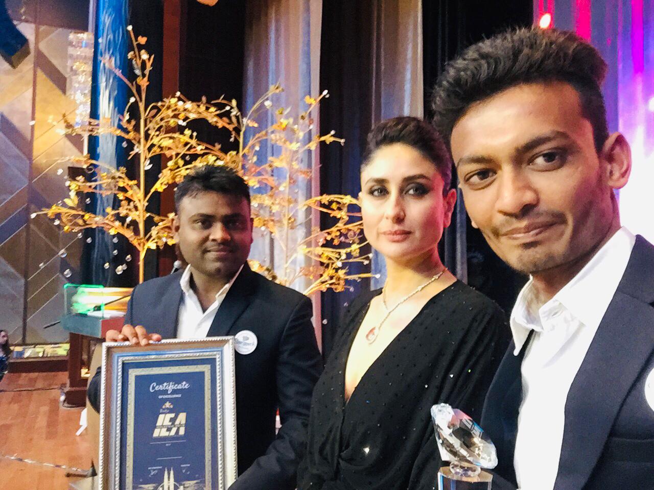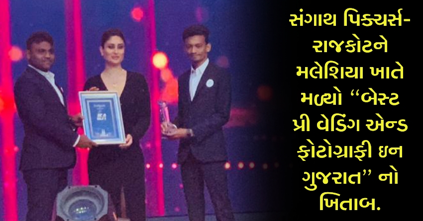 સંગાથ પિક્ચર્સ- રાજકોટ ને મલેશિયા ખાતે સુપ્રસિધ એક્ટ્રેસ કરીના કપૂર ના હસ્તે મળ્યો “બેસ્ટ પ્રી વેડિંગ એન્ડ ફોટોગ્રાફી ઇન ગુજરાત” નો ખિતાબ. હિતેશ ભાઈ વેકરીયા અને રવિભાઈ સાવલિયા એ સ્વીકાર્યો એવોર્ડ.