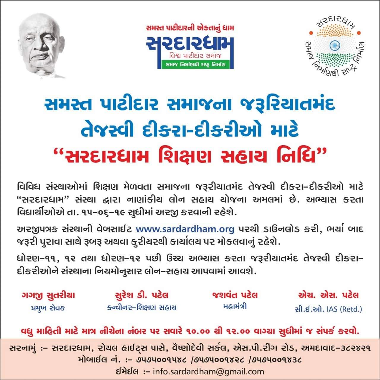 સમસ્ત પાટીદાર સમાજના જરૂરિયાતમંદ તેજસ્વી વિદ્યાર્થીઓ માટે “સરદારધામ શિક્ષણ સહાય નિધિ”
