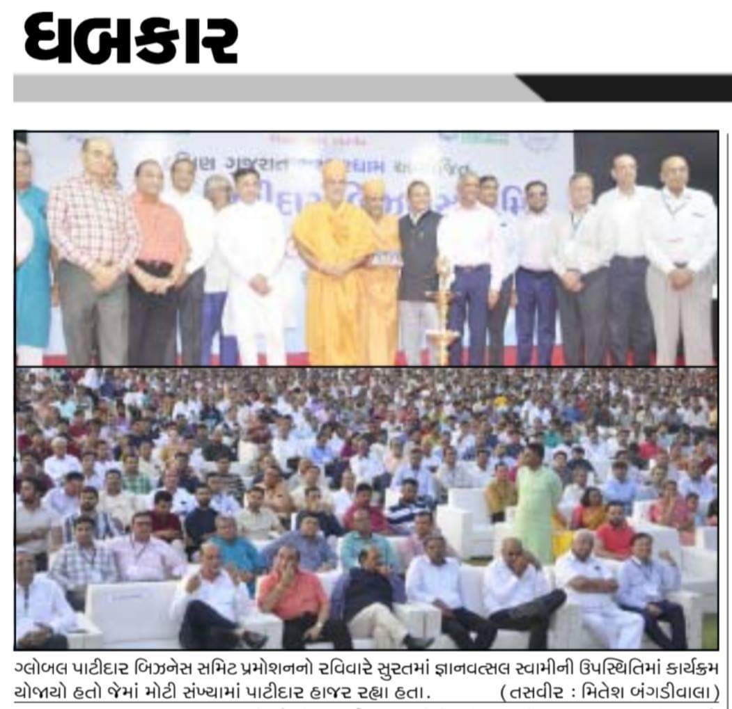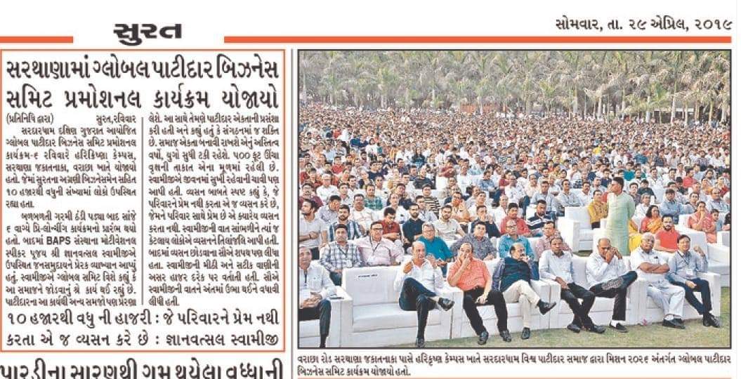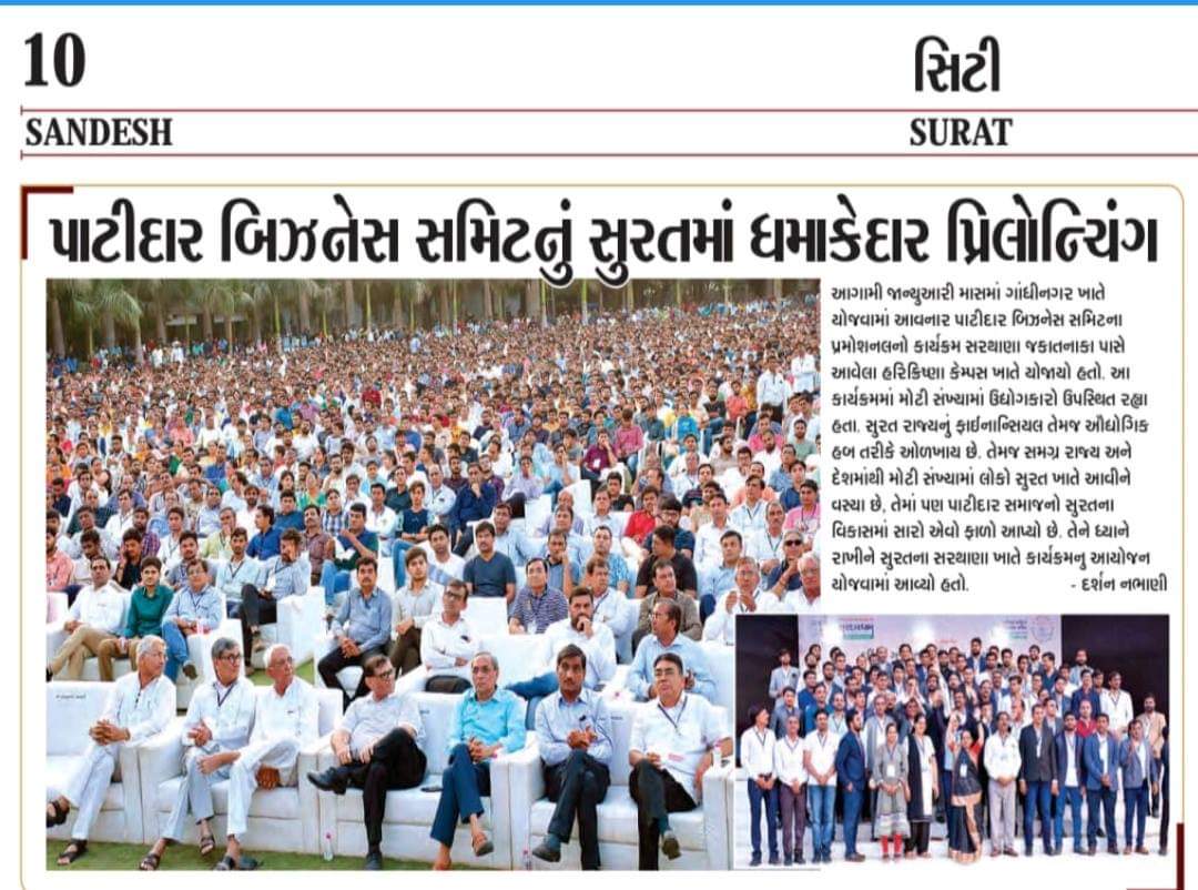 3થી 5 જાન્યુઆરી 2020માં ગાંધીનગરમાં યોજનારા ગ્લોબલ પાટીદાર બિઝનેસ સમિટના પ્રમોશનલ માટે સુરતમાં યોજાયેલા કાર્યક્રમમાં 10 હજાર લોકો હાજર રહ્યાં હતાં. પાટીદાર સમાજના આગેવાનોની સંસ્થા ‘સરદારધામ’ થકી વિવિધ શહેરોમાં વિવિધ પ્રોજેક્ટો શરૂ કરાઇ રહ્યા છે. રવિવારે સરથાણા ખાતે યોજાયેલા પ્રમોશનલ કાર્યક્રમમાં હાજર વકતાઓએ 10 હજાર પાટીદાર ઉદ્યોગપતિઓને ટેક્નોલોજીના સહારે વિશ્વ સાથે કદમથી કદમ મિલાવવાની હાકલ કરી હતી.