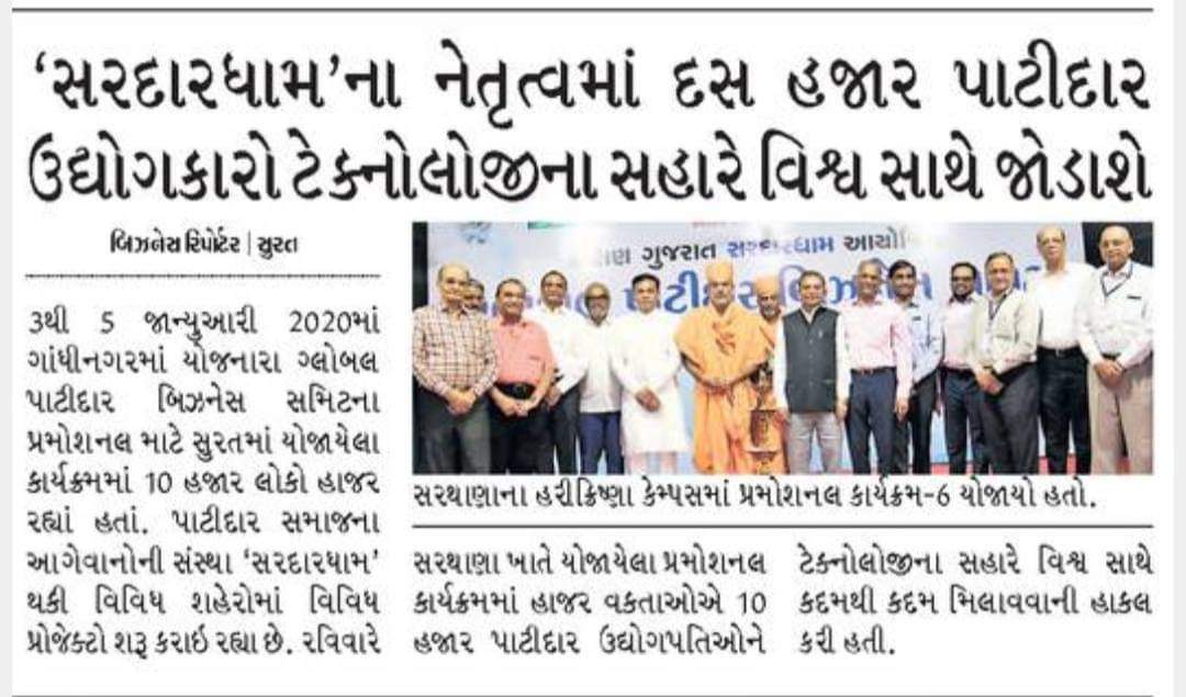 ‘સરદારધામ’ના નેતૃત્વમાં દસ હજાર પાટીદાર ઉદ્યોગકારો ટેક્નોલોજીના સહારે વિશ્વ સાથે જોડાશે
