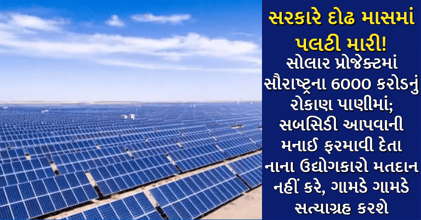 સરકારે દોઢ માસમાં પલટી મારી! સોલાર પ્રોજેક્ટમાં સૌરાષ્ટ્રના 6000 કરોડનું રોકાણ પાણીમાં; સબસિડી આપવાની મનાઈ ફરમાવી દેતા નાના ઉદ્યોગકારો મતદાન નહીં કરે, ગામડે ગામડે સત્યાગ્રહ કરશે
