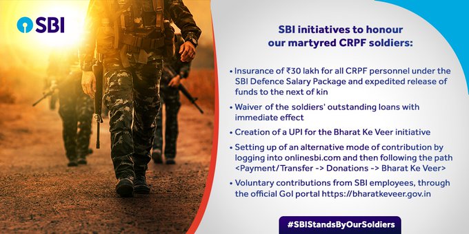 આ સિવાય બેંકે ભારતના વીર વેબસાઇટ મારફતે લોકોને જવાનોની મદદ કરવા માટે પણ અપીલ કરી છે. બેંકે આના માટે UPI સપોર્ટ જાહેર કર્યો છે, જેની મદદથી તમે UPI કોડ સ્કેન કરીને શહીદોને આર્થિક મદદ કરી શકો છો.