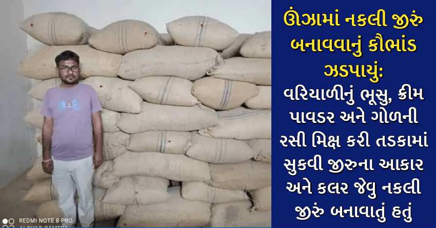 ઊંઝામાં નકલી જીરું બનાવવાનું કૌભાંડ ઝડપાયું: વરિયાળીનું ભૂસુ, ક્રીમ પાવડર અને ગોળની રસી મિક્ષ કરી તડકામાં સુકવી જીરુના આકાર અને કલર જેવુ નકલી જીરું બનાવાતું હતું