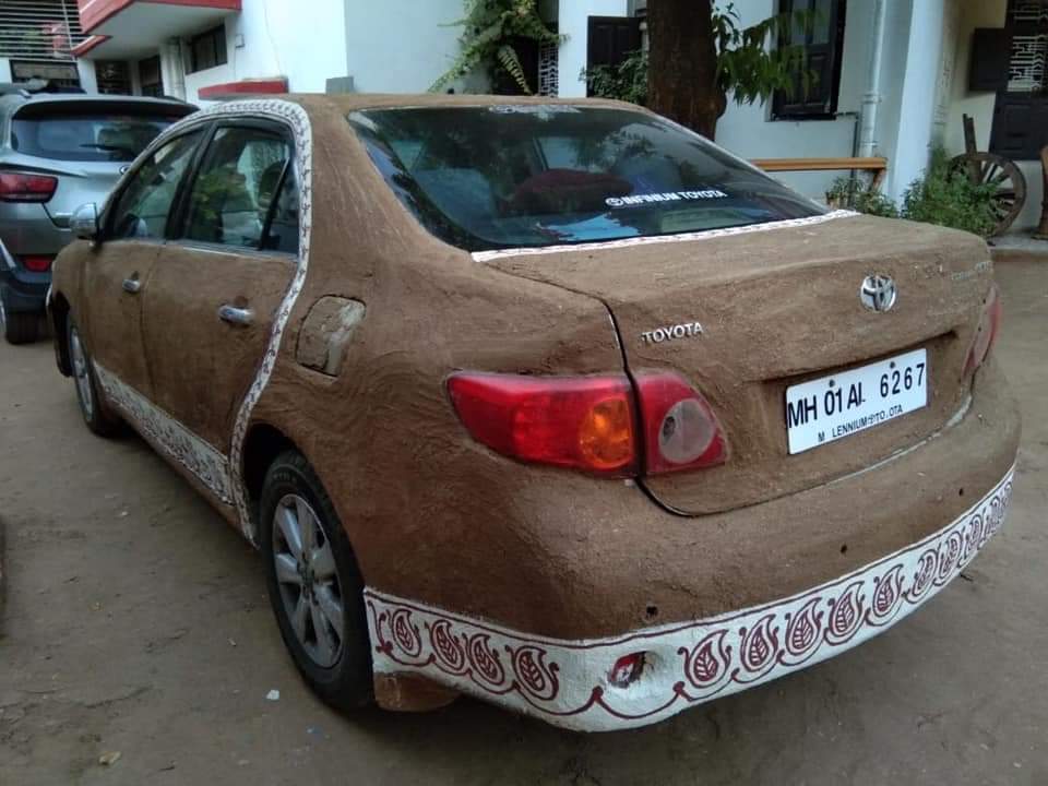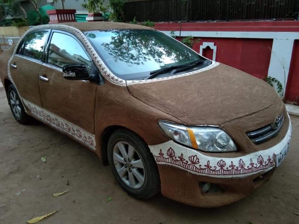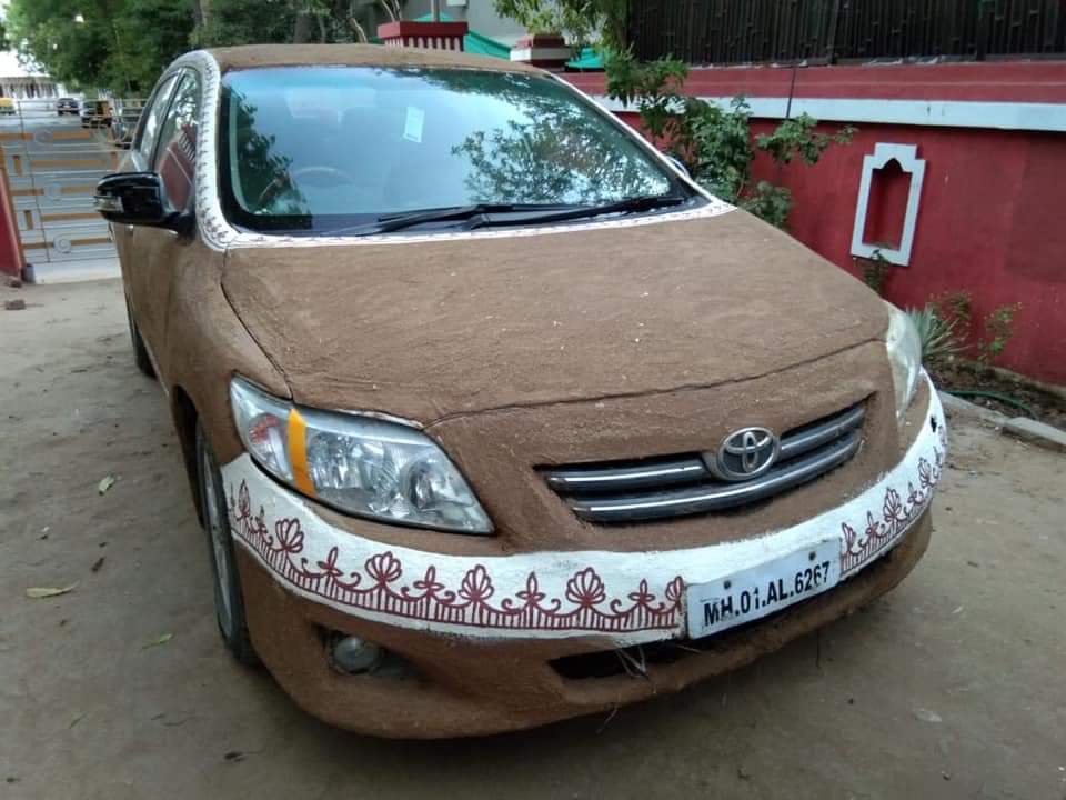 ફોટામાં સેડાન ટોયોટા કાર પર ગાયના છાણનું લેયર જોઈ શકાય છે.