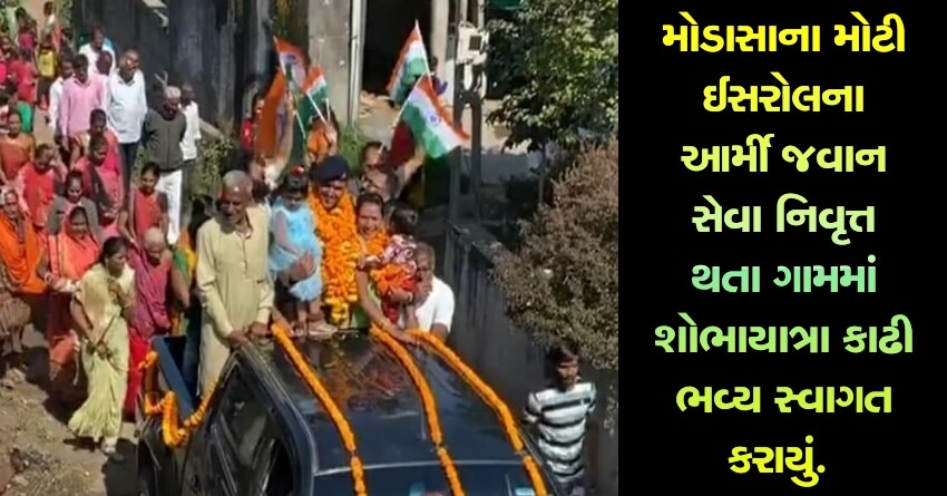મોડાસાના મોટી ઈસરોલના આર્મી જવાન સેવા નિવૃત્ત થતા ગામમાં શોભાયાત્રા કાઢી ભવ્ય સ્વાગત કરાયું