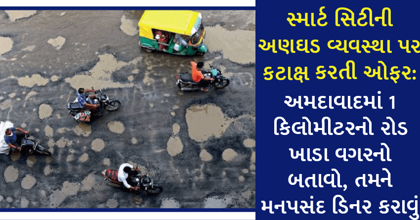 સ્માર્ટ સિટીની અણઘડ વ્યવસ્થા પર કટાક્ષ કરતી ઓફર: અમદાવાદમાં 1 કિલોમીટરનો રોડ ખાડા વગરનો બતાવો, તમને મનપસંદ ડિનર કરાવું
