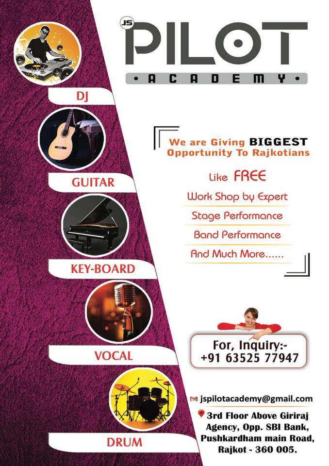 રાજકોટ – રાજકોટ એટલે રંગીલું શહેર અને રાજકોટ ના લોકો એટલે દરેક ક્ષેત્ર માં નિપૂર્ણ હોઈ પછી એ અભ્યાસ હોઈ, ક્રિકેટ હોઈ ભલે ને પછી સંગીત કે ગાયક ક્ષેત્ર હોઈ એવી જ રીતે રાજકોટ ની શોખ પ્રિય જનતા માટે પાયલટ એકેડેમી લાવ્યું છે બાળક ના સ્વપ્ના ને સાકાર કરવા અને જેમને પ્રોફેશનલ ડી જે. ગીટાર, કી બોર્ડ , વોકલ, ડ્રમર બનવું હોઈ એમના માટે નીશણાત ફેકલ્ટી ના માર્ગદર્શન હેઠળ અલગ અલગ કોર્ષ.