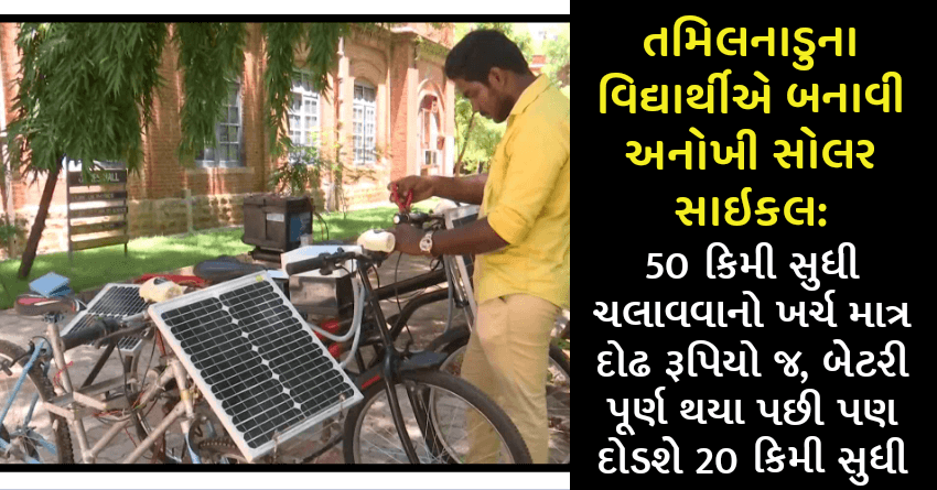 મદુરાઈનો રહેવાસી વિદ્યાર્થી ધનુષ કુમારે સોલર પેનલની મદદથી એક સોલર સાઇકલ બનાવી છે. આ સાઇકલની વિશેષ વાત એ છે કે એને એક વખતમાં ચાર્જ કરવા પર 50 કિમી સુધી ચલાવી શકાય છે. બેટરી ડિસ્ચાર્જ થયા બાદ પણ એને 20 કિમી સુધી ચલાવી શકાય છે. આ સોલર સાઇકલ દ્વારા 50 કિમી સુધી ચલાવવાનો ખર્ચ માત્ર 1.50 રૂપિયો જ થાય છે. એને સાઇકલ અને બાઇક બંને રીતે ઉપયોગમાં લઈ શકાય છે.