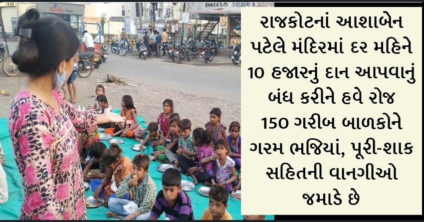 રાજકોટનાં આશાબેન પટેલે મંદિરમાં દર મહિને 10 હજારનું દાન આપવાનું બંધ કરીને હવે રોજ 150 ગરીબ બાળકોને ગરમ ભજિયાં, પૂરી-શાક સહિતની વાનગીઓ જમાડે છે