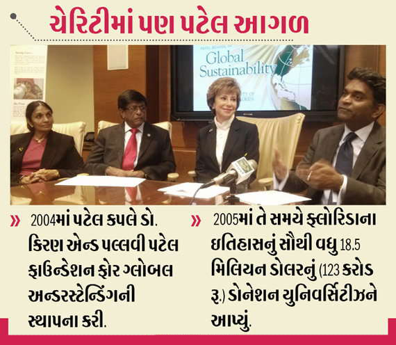 ગુજરાતી માતા-પિતાને ત્યાં ઝામ્બિયામાં જન્મેલા કિરણ પટેલ અને તેમનાં પીડિયાટ્રિશિયન પત્ની પલ્લવી પટેલે મિયામી નજીક આવેલી નોવા સાઉથઇસ્ટર્ન યુનિવર્સિટીને આપેલા દાનથી યુનિવર્સિટી ટેમ્પામાં નવું કેમ્પસ શરૂ કરી શકાશે. કિરણ એક પૂર્વ કાર્ડીયોલોજિસ્ટ છે. જેઓ હાલ ટેમ્પા ખાતે ફ્રીડમ હેલ્થ નામની એક કંપની ચલાવે છે. પટેલ ફેમિલી ફાઉન્ડેશન દ્વારા અપાયેલા દાનમાં 5 કરોડ ડોલર ભેટના રૂપમાં રહેશે, જ્યારે બાકીના 15 કરોડ ડોલર રૂપિયા યુનિવર્સિટીના નવા કેમ્પસમાં આકાર લેનારા 32,5000 ચોરસ ફૂટના મેડિકલ એજ્યુકેશન કોમ્પ્લેક્સમાં રિયલ એસ્ટેટ અને સુવિધા નિર્માણ માટે અપાશે.