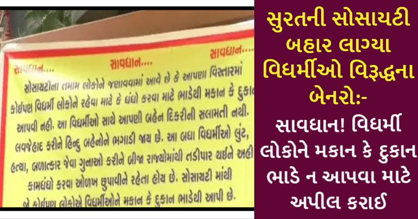 સુરતની સોસાયટીના ગેટ પાસે બોર્ડ લગાવામાં આવ્યું છે જેમાં લખવામાં આવ્યું છે કે સોસાયટીના તમામ લોકોને જણાવવામાં આવે છે કે આપણા વિસ્તારમાં કોઈપણ વિધર્મી લોકોને રહેવા માટે કે ધંધો કરવા માટે ભાડેથી મકાન કે દુકાન ભાડે આપવી નહી. આ વિધર્મીઓ સાથે આપણી બહેન દિકરીની સલામતી નથી. વધુમાં લખવામાં આવ્યું છે લવ જેહાદ કરીને હિન્દુ બહેનોને ભગાડી જાય છે. આ બધા વિધર્મી લૂંટ, હત્યા, બળાત્કાર જેવા ગુનાઓ કરીને બીજા રાજ્યોમાંથી તડીપાર થઈને અહીં કામધંધો કરવા ઓળખ છુપાવીને રહેતા હોય છે. સોસાયટી માંથી જો કોઈપણ લોકોએ વિધર્મીઓને મકાન કે દુકાન ભાડેથી આપી છે. તેઓ તાત્કાલીક ખાલી કરાવે નહીંતર કોઈપણ ખરાબ ઘટના બનશે અને તેમની સંપત્તિને નુકશાન થશે તો જવાબદારી તેમની પોતાની રહેશે.