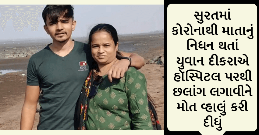 સુરતમાં કોરોના કહેર વચ્ચે પરિવારોના માળા પીંખાઈ રહ્યા છે. નવો સ્ટ્રેઈનમાં આખા પરિવારો કોરોનાની ઝપટમાં આવી રહ્યા છે. આ કારણે મુશ્કેલીમાં વધારો થયો છે. કોરોનાને કારણે હવે પરિવારોના માળા તૂટવા લાગ્યા છે. જેનું એક ઉદાહરણ સુરતમાં જોવા મળ્યું હતું. કોરોનાની સારવાર દરમિયાન માતાનું મોત થતાં પુત્રને ઘેરો આઘાત લાગ્યો હતો. જે બાદમાં તેણે હૉસ્પિટલ પરથી છલાંગ લગાવીને આપઘાત કરી લીધો હતો. સુરતમાં આવેલી સંજીવની હૉસ્પિટલમાં કોરોનાની સારવાર લઈ રહેલી માતાના નિધનના સમાચાર મળતા જ પુત્ર શોકમાં ગરકાવ થઈ ગયો હતો અને પોતે પણ મોત વ્હાલું કરી લીધું હતું.