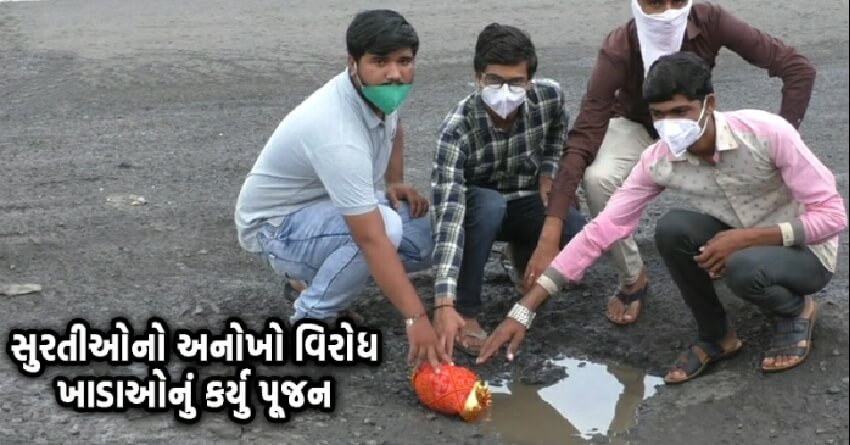 સુરતમાં નેશનલ હાઈવેના હાલ બેહાલ થતા યુવાનોએ ખાડાઓનું પૂજન કરીને અનોખો વિરોધ કર્યો