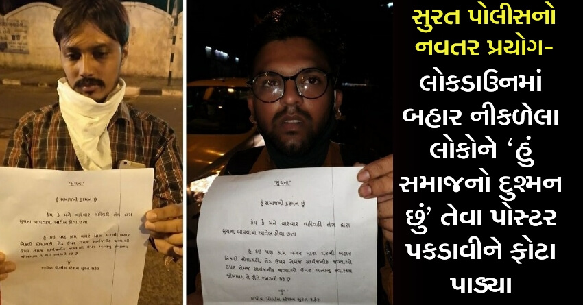 સુરત પોલીસનો નવતર પ્રયોગ- લોકોને ‘હું સમાજનો દુશ્મન છું’ તેવા પોસ્ટર પકડાવી લોકડાઉનમાં બહાર નીકળેલા લોકોનાં ફોટા પાડ્યા
