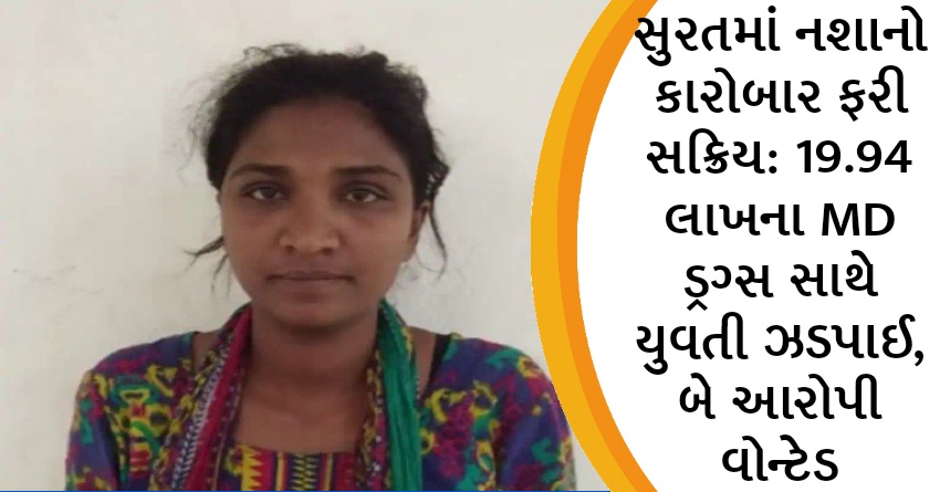 સુરતમાં નશાનો કારોબાર ફરી સક્રિય: 19.94 લાખના MD ડ્રગ્સ સાથે યુવતી ઝડપાઈ, બે આરોપી વોન્ટેડ