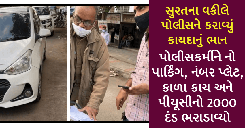 સુરતના વકીલે પોલીસને કરાવ્યું કાયદાનું ભાન, પોલીસકર્મીને નો પાર્કિંગ, નંબર પ્લેટ, કાળા કાચ અને પીયૂસીનો 2000 દંડ ભરાડાવ્યો