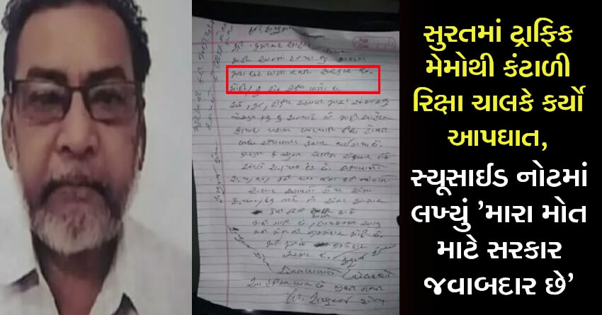સુરતમાં ટ્રાફિક મેમોથી કંટાળી રિક્ષા ચાલકે કર્યો આપઘાત, સ્યૂસાઈડ નોટમાં લખ્યું ‘મારા મોત માટે સરકાર જવાબદાર છે’