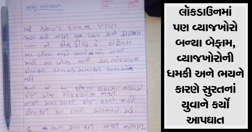 કોરોના વાયરસને કારણે એક બાજુ લૉકડાઉન ચાલી રહ્યું છે. જેના કારણે નાના મોટા ધંધા પડી ભાંગ્યા છે. જે લોકોએ ધંધા વેપાર માટે વ્યાજે રૂપિયા લીધા હતા તેમની હાલત કફોડી થઇ ગઇ છે. આવા સમયમાં પણ વ્યાજખોરો તગડી ઉઘરાણી કરવાનું છોડતા નથી. આવો જ એક કેસ નોંધાયો છે. શહેરમાં વ્યાજખોરોની ધમકી અને ભયને કારણે એક યુવાને આપઘાત કરી લીધો છે. તેણે મરતા પહેલા એક સુસાઇડ નોટ પણ લખી છે.