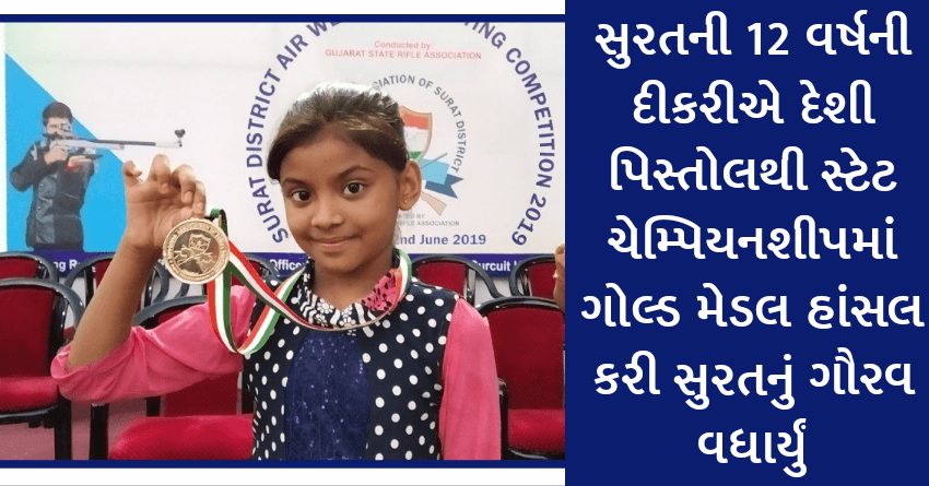 સુરતની 12 વર્ષની દીકરીએ દેશી પિસ્તોલથી સ્ટેટ ચેમ્પિયનશીપમાં ગોલ્ડ મેડલ હાંસલ કરી સુરતનું ગૌરવ વધાર્યું