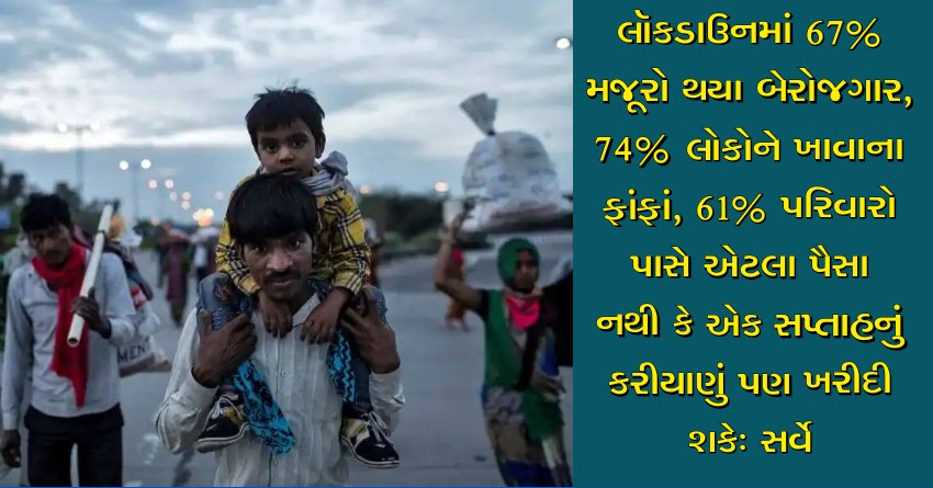 લૉકડાઉનમાં 67% મજૂરો થયા બેરોજગાર, 74% લોકોને ખાવાના ફાંફાં, 61% પરિવારો પાસે એટલા પૈસા નથી કે એક સપ્તાહનું કરીયાણું પણ ખરીદી શકે: સર્વે