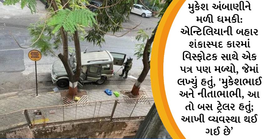 મુકેશ અંબાણીને મળી ધમકી: એન્ટિલિયાની બહાર શંકાસ્પદ કારમાં વિસ્ફોટક સાથે એક પત્ર પણ મળ્યો, જેમાં લખ્યું હતું, ‘મુકેશભાઈ અને નીતાભાભી, આ તો બસ ટ્રેલર હતું; આખી વ્યવસ્થા થઈ ગઈ છે’