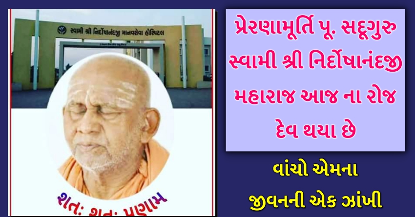 પ્રેરણામૂર્તિ પૂ. સદૂગુરુ સ્વામી શ્રી નિર્દોષાનંદજી મહારાજ આજ ના રોજ દેવ થયા છે