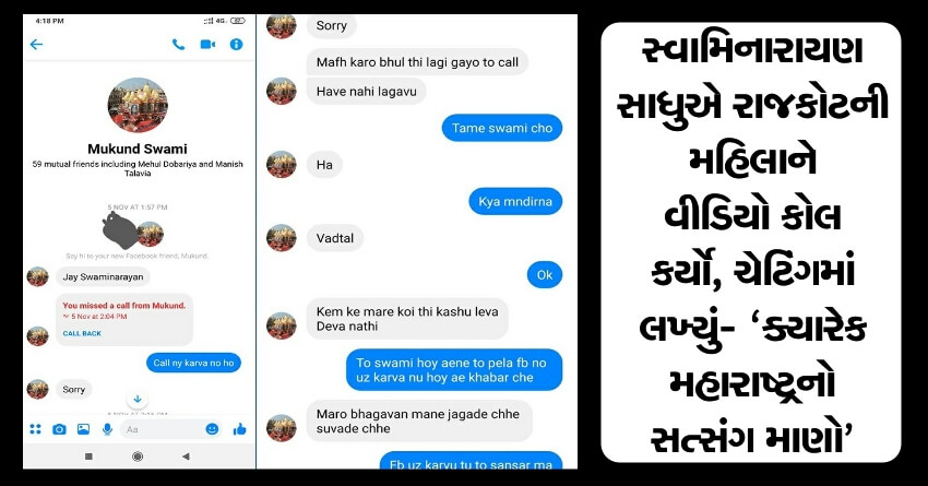 સ્વામિનારાયણ સાધુએ રાજકોટની મહિલાને વીડિયો કોલ કર્યો, ચેટિંગમાં લખ્યું- ‘ક્યારેક મહારાષ્ટ્રનો સત્સંગ માણો’