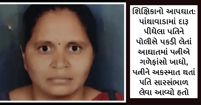 શિક્ષિકાનો આપઘાત: પાંથાવાડામાં દારૂ પીધેલા પતિને પોલીસે પકડી લેતાં આઘાતમાં પત્નીએ ગળેફાંસો ખાધો, પત્નીને અકસ્માત થતાં પતિ સારસંભાળ લેવા આવ્યો હતો