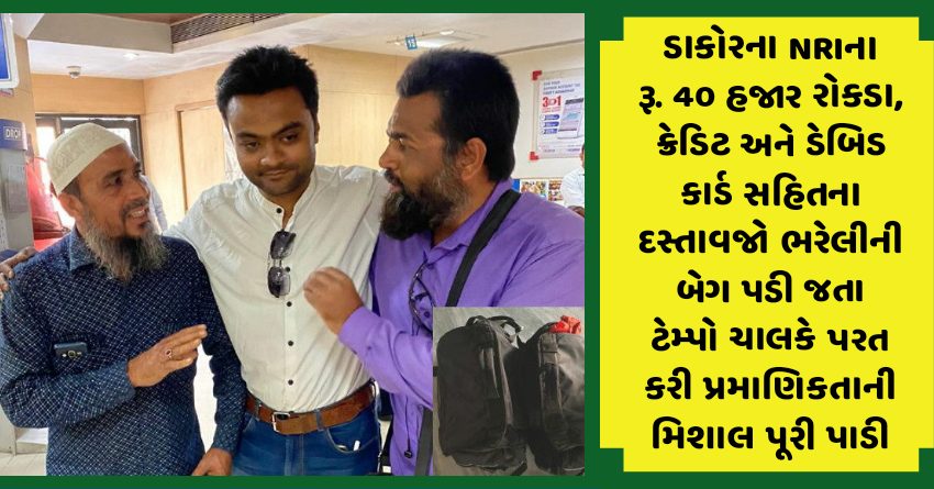 ડાકોરના NRIના રૂ. 40 હજાર રોકડા, ક્રેડિટ અને ડેબિડ કાર્ડ સહિતના દસ્તાવજો ભરેલીની બેગ પડી જતા ટેમ્પો ચાલકે પરત કરી પ્રમાણિકતાની મિશાલ પૂરી પાડી