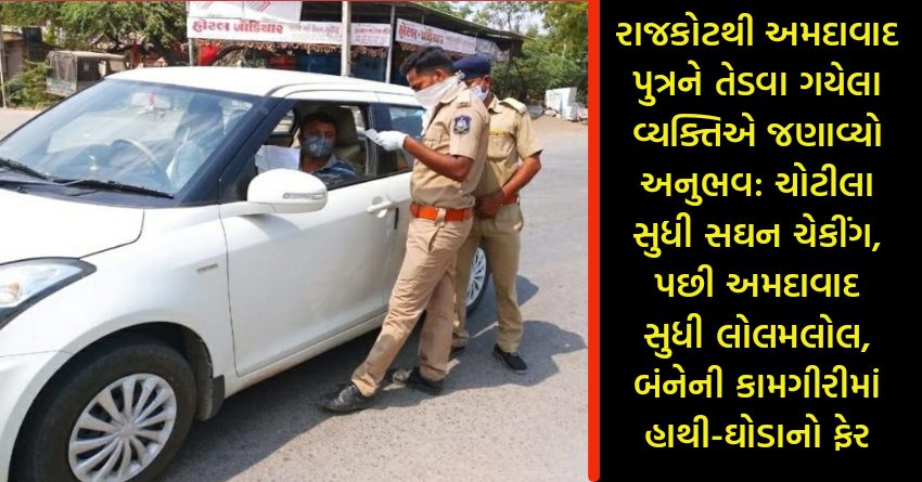 રાજકોટથી અમદાવાદ પુત્રને તેડવા ગયેલા કશ્યપ પટ્ટણીએ રાજકોટ અને અમદાવાદ પોલીસ અને આરોગ્ય ટીમની કામગીરીનો અનુભવ વર્ણવ્યો છે. જેમાં રાજકોટ પોલીસ અને આરોગ્ય ટીમની કામગીરીને ખોબલે ખોબલે વખાણી છે. જ્યારે બીજી તરફ અમદાવાદ પોલીસ અને આરોગ્ય ટીમની કામગીરીમાં ક્યાંકને ક્યાંક ખોટ અનુભવી હતી. બંને શહેરની પોલીસ અને આરોગ્ય ટીમની કામગીરીમાં હાથી-ઘોડાનો ફેર હોવાનું જાણવા મળ્યું છે. તેઓએ પોતાના અનુભવ મિત્રો સાથે શેર કર્યો છે. જેમાં જણાવ્યું છે કે, ચોટીલા સુધી હું સતત ચેક થયો, દરેક ચેક પોસ્ટ પર મને ચેક કર્યો પરંતુ ચોટીલા પછી બધુ લોલમલોલ જોવા મળ્યું અને મને અમદાવાદ સુધીએ કોઇએ રોક્યો નહી. આ વાત સોશિયલ મીડિયા પર વાઇરલ થઇ છે.