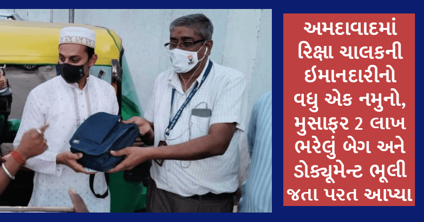 અમદાવાદમાં રિક્ષા ચાલકની ઇમાનદારીનો વધુ એક નમુનો, મુસાફર 2 લાખ ભરેલું બેગ અને ડોક્યૂમેન્ટ ભૂલી જતા પરત આપ્યા