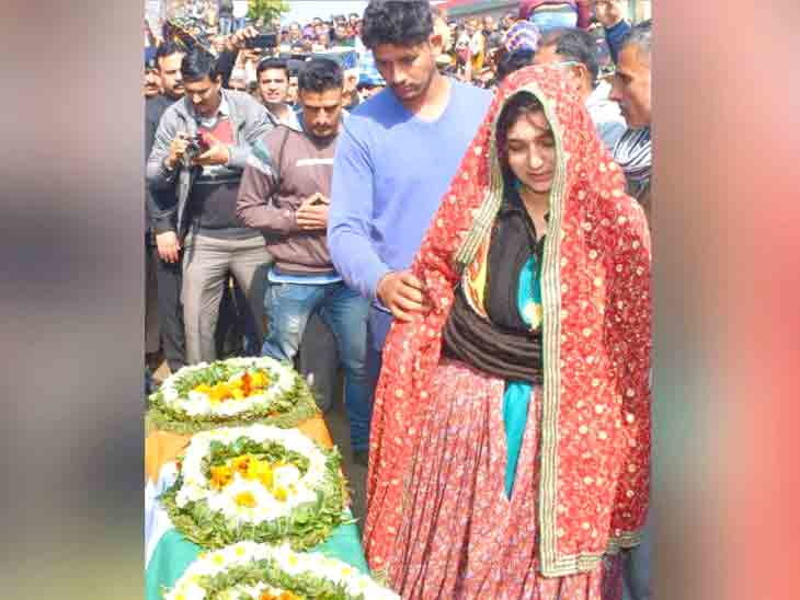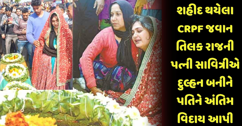 શહીદ થયેલા સીઆરપીએફ જવાન તિલક રાજની પત્ની સાવિત્રીએ દુલ્હન બનીને પતિને અંતિમ વિદાય આપી