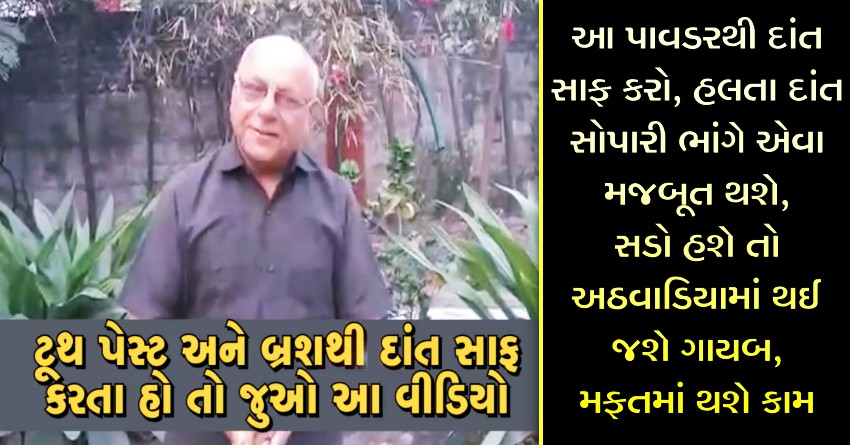 વેરાવળના સિનિયર સિટીઝન, સામાજિક કાર્યકર અને યોગા ટ્રેનર એવા ખેતસીભાઈ મૈઠિયા ફરી વાર એક નવો વીડિયો લઈને આપણી સમક્ષ હાજર થયા છે ખેતસીભાઈ મૈઠિયાએ દાંતની સ્વચ્છતા માટેનો એક અદભુત પાવડર બતાવ્યો છે. આ પાવડરને દાંત પર લગાવવાથી મોં ક્યારેય વાસ મારશે નહીં. ખેતસીભાઈનું કહેવું છે કે, અઠવાડિયા સુધી આ પાવડરનો પ્રયોગ કરવાથી દાંતમાં સડો હોય તો પણ દૂર થઈ જાય છે, એટલું જ નહીં હલતા દાંત પણ મજબૂત થઈ જાય છે. મહત્ત્વની વાત તો એ છે કે, સાવ નજીવા ખર્ચમાં ઘરબેઠા આ પાવડર બનાવી શકાય છે.