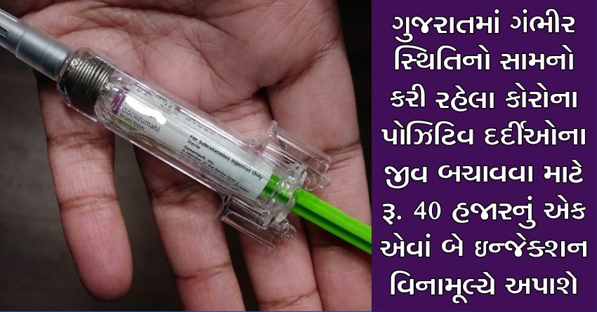 ગુજરાતમાં ગંભીર સ્થિતિનો સામનો કરી રહેલા કોરોના પોઝિટિવ દર્દીઓના જીવ બચાવવા માટે રૂ. 40 હજારનું એક એવાં બે ઇન્જેક્શન વિનામૂલ્યે અપાશે, જેનાથી મૃત્યુનું પ્રમાણ ઘટશે