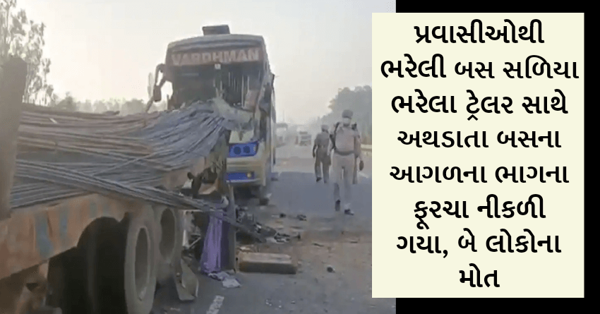 પ્રવાસીઓથી ભરેલી બસ સળિયા ભરેલા ટ્રેલર સાથે અથડાતા બસના આગળના ભાગના ફૂરચા નીકળી ગયા, બે લોકોના મોત