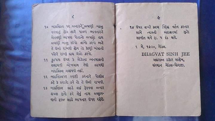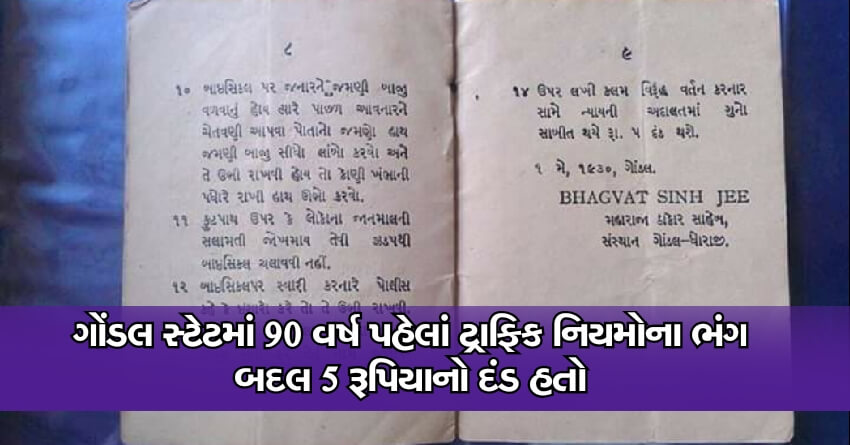 આ લખાણ સાથે ગોંડલ સ્ટેટના (Gondal State) જૂના ટ્રાફિક (Traffic law) નિયમોના પુસ્તકની તસવીર સોશિયલ મીડિયામાં (Soclial media)વાયરલ થઈ છે. રાજ્ય સરકારે મોટર વ્હીકલ એક્ટના નિયમન લાગુ કરવા માટેની મર્યાદામાં વધારો કર્યો છે. લોકોમાં ટ્રાફિકના નવા કાયદા અને દંડની જોગવાઈ (New Motorvehicle act) સામે વિરોધ જોવા મળી રહ્યો છે ત્યારે સોશિયલ મીડિયામાં આ ગોંડલ સ્ટેટના જૂનવાણી કાયદાની તસવીર ખૂબ જ વાયરલ થઈ છે.
