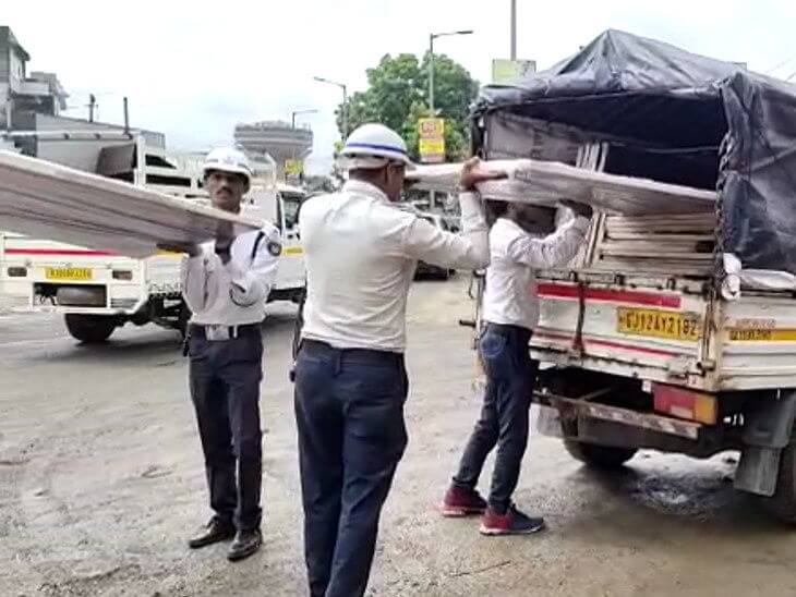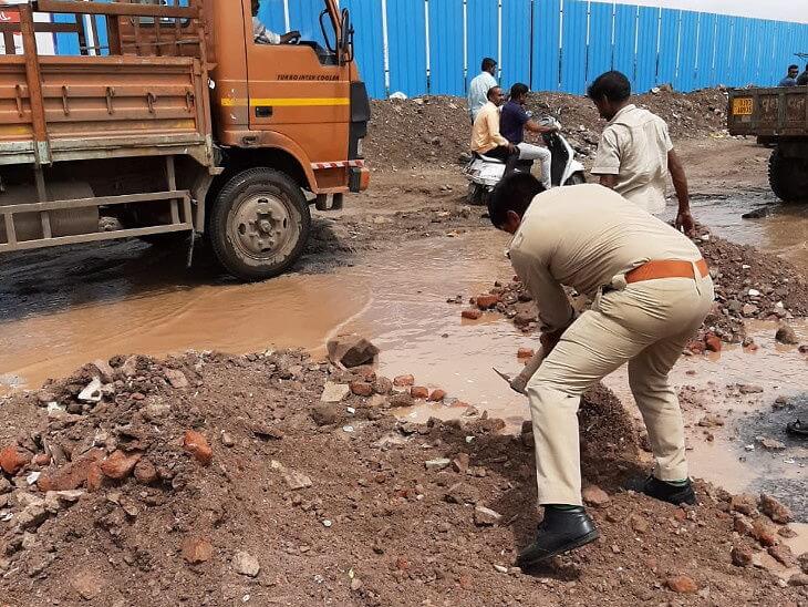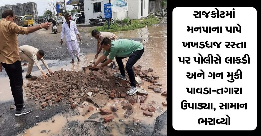 રાજકોટમાં મનપાના પાપે ખખડધજ રસ્તા પર પોલીસે લાકડી અને ગન મુકી પાવડા-તગારા ઉપાડ્યા, સામાન ભરાવ્યો