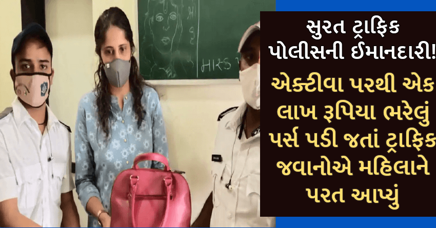 સુરત ટ્રાફિક પોલીસની ઈમાનદારી! એક્ટીવા પરથી એક લાખ રૂપિયા ભરેલું પર્સ પડી જતાં ટ્રાફિક જવાનોએ મહિલાને પરત આપ્યું
