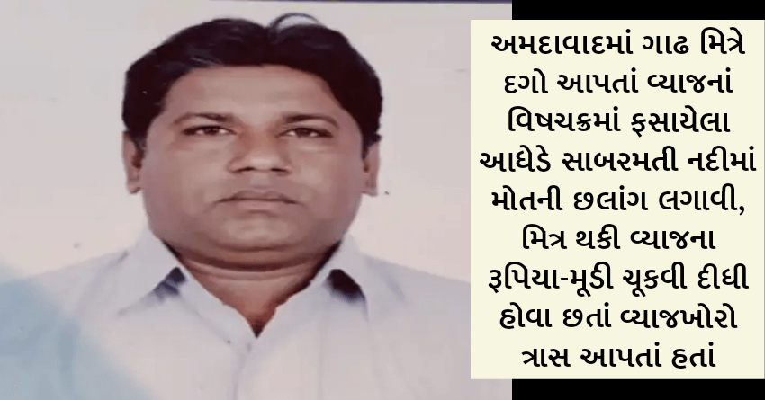 અમદાવાદમાં ગાઢ મિત્રે દગો આપતાં વ્યાજનાં વિષચક્રમાં ફસાયેલા આધેડે સાબરમતી નદીમાં મોતની છલાંગ લગાવી, મિત્ર થકી વ્યાજના રૂપિયા-મૂડી ચૂકવી દીધી હોવા છતાં વ્યાજખોરો ત્રાસ આપતાં હતાં
