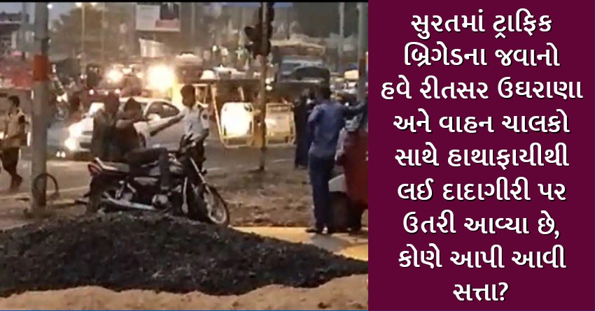 સુરતમાં ટ્રાફિક બ્રિગેડના જવાનો હવે રીતસર ઉઘરાણા અને વાહન ચાલકો સાથે હાથાફાયીથી લઈ દાદાગીરી પર ઉતરી આવ્યા છે, વિડિયો વાયરલ થયો, કોણે આપી આવી સત્તા?