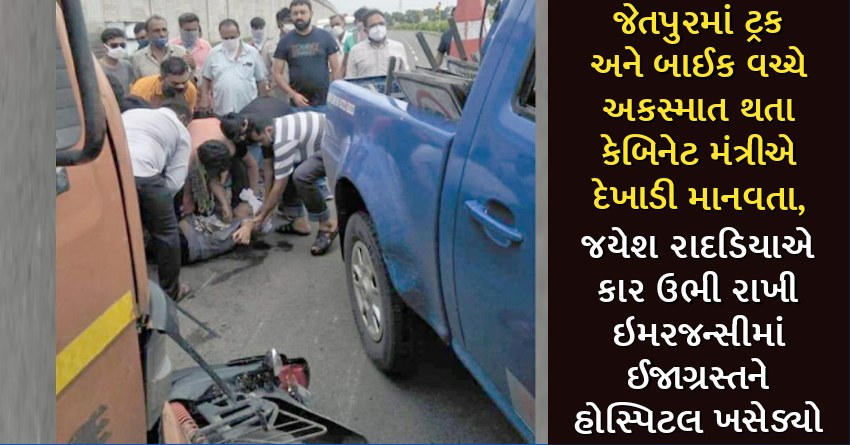 જેતપુરમાં ટ્રક અને બાઈક વચ્ચે અકસ્માત થતા કેબિનેટ મંત્રીએ દેખાડી માનવતા, જયેશ રાદડિયાએ કાર ઉભી રાખી ઇમરજન્સીમાં ઈજાગ્રસ્તને હોસ્પિટલ ખસેડ્યો